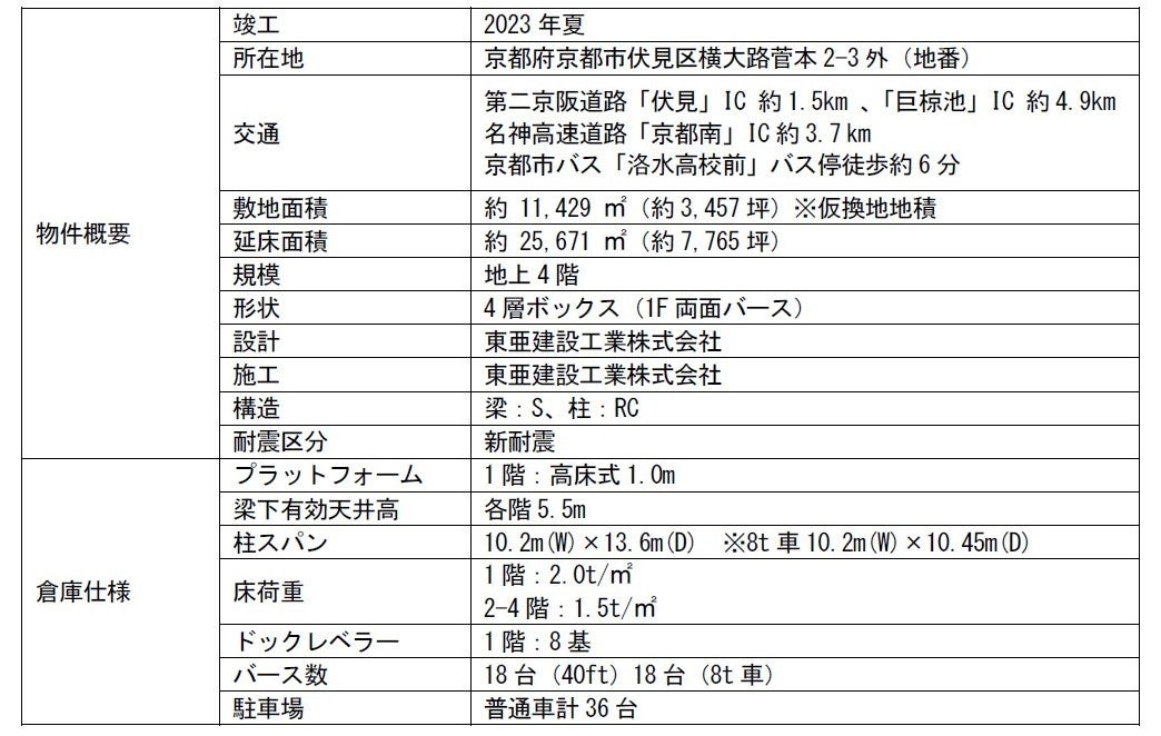 本物件は、西濃運輸株式会社(本社:岐阜県大垣市、代表取締役社長:小寺 康久)の専用拠点としての入居が内定しており、同社の京都支店の移転先としての開業を予定しております。