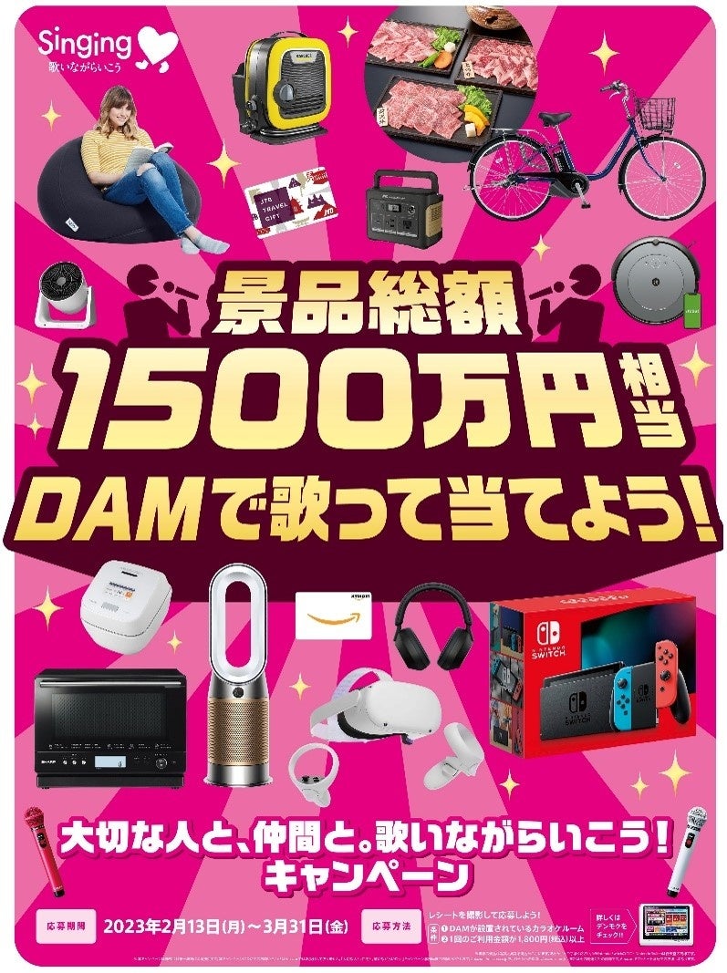 DAM設置のカラオケルームにて1,800円(税込)以上ご利用いただいた方に、レシートの枚数に応じて総額1,500万円相当の豪華景品を抽選でプレゼントします。
