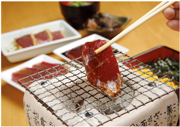 提供店それぞれが創意工夫して味付けした2種類の漬けかつおを、自分で炙って食べる新しいグルメです。 もちろん、新鮮なかつおは炙らずにそのまま食べても美味。例えば「港の駅めいつ」では、日南の漁師町ならではの「特製しょう油ダレ」と「塩ダレ」の2つの味わいが楽しめます。現在、日南市内の10店舗で提供されています。
