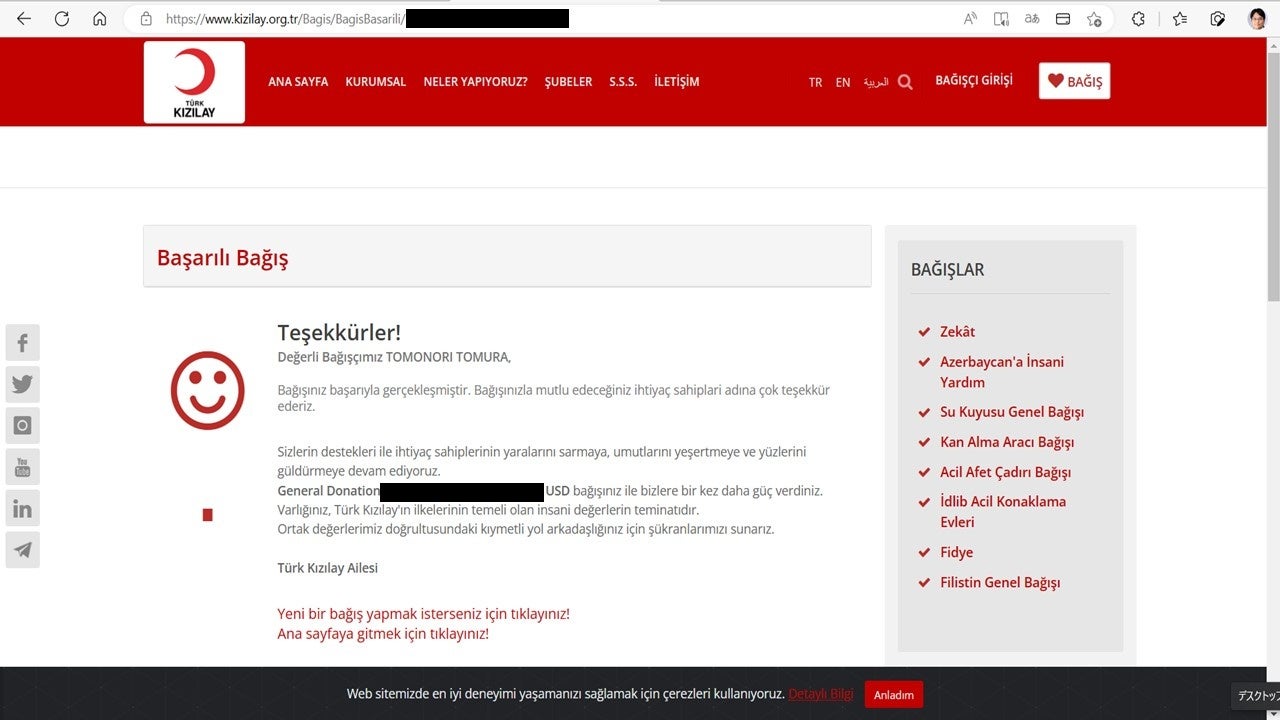 ・寄付ページ: https://www.kizilay.org.tr/Bagis/BagisYap/43/general-donation (同社さまのページにて右上の言語指定を英語(EN)にて対応致しました。)