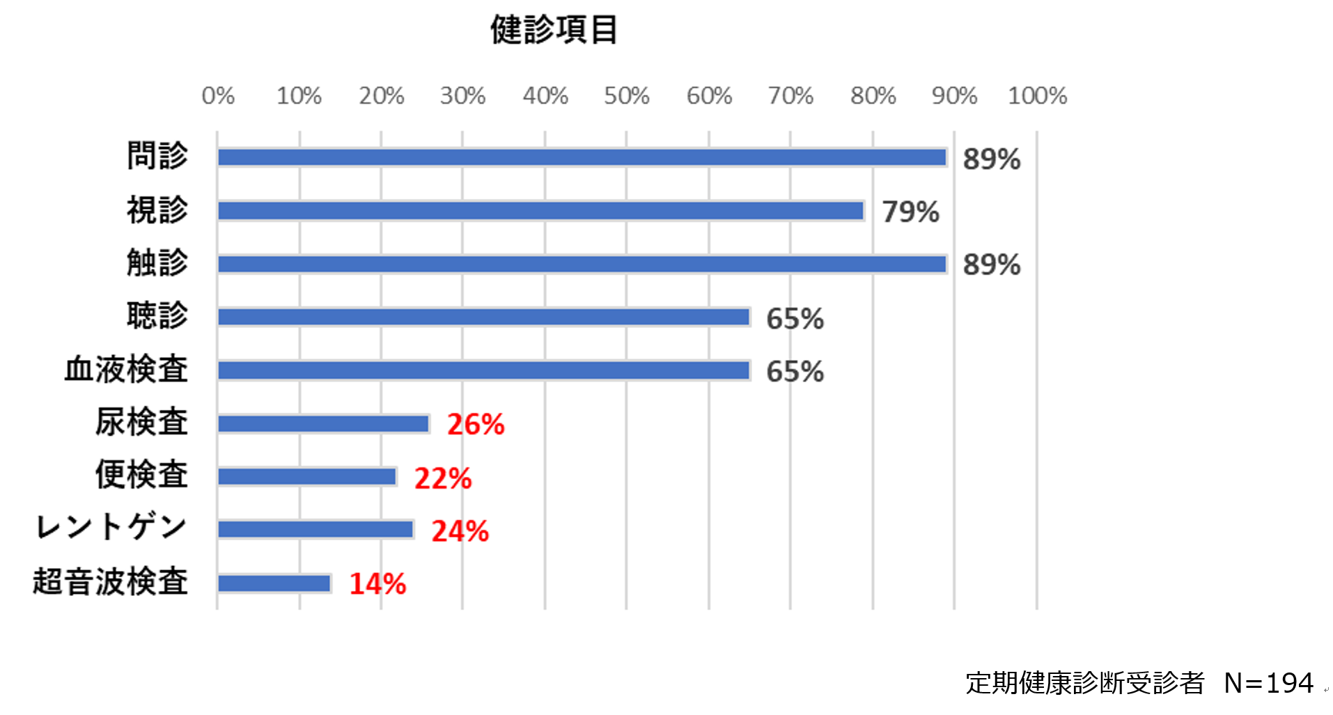 ●定期健康診断で受診している項目は、問診・触診・視診が約8~9割。血液検査は7割、聴診が6割。泌尿器や消化器、内臓疾患の発見に役立つ、尿検査・便検査・レントゲンは2~3割の受診にとどまる。全身状態を把握するためには、尿検査・便検査・レントゲン検査まで受けることが今後の課題。