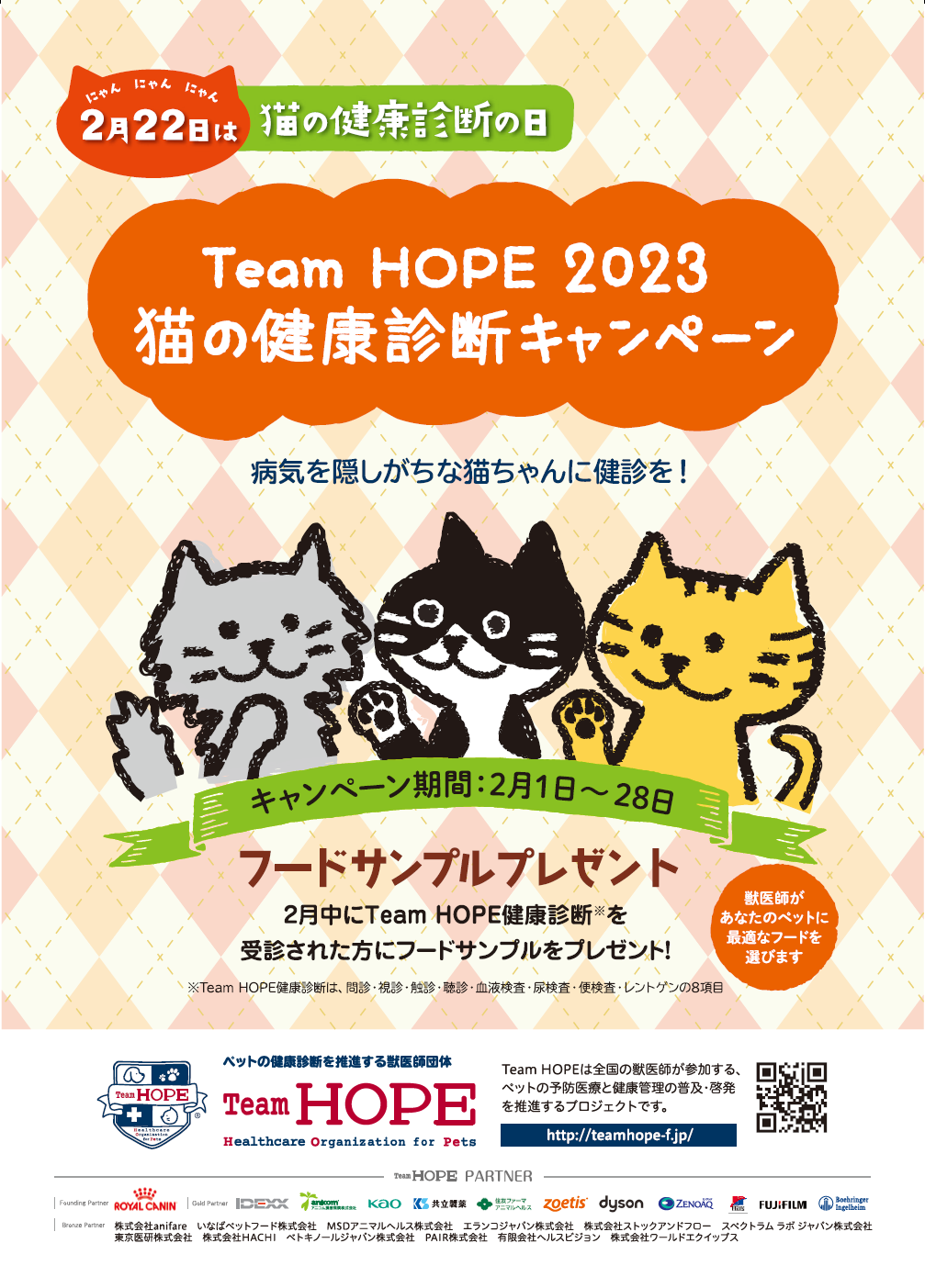 賛同動物病院では、今年も2月1日~28日の期間、「猫の健康診断キャンペーン」を実施します。詳しくはTeam HOPE猫の健康診断特設サイト