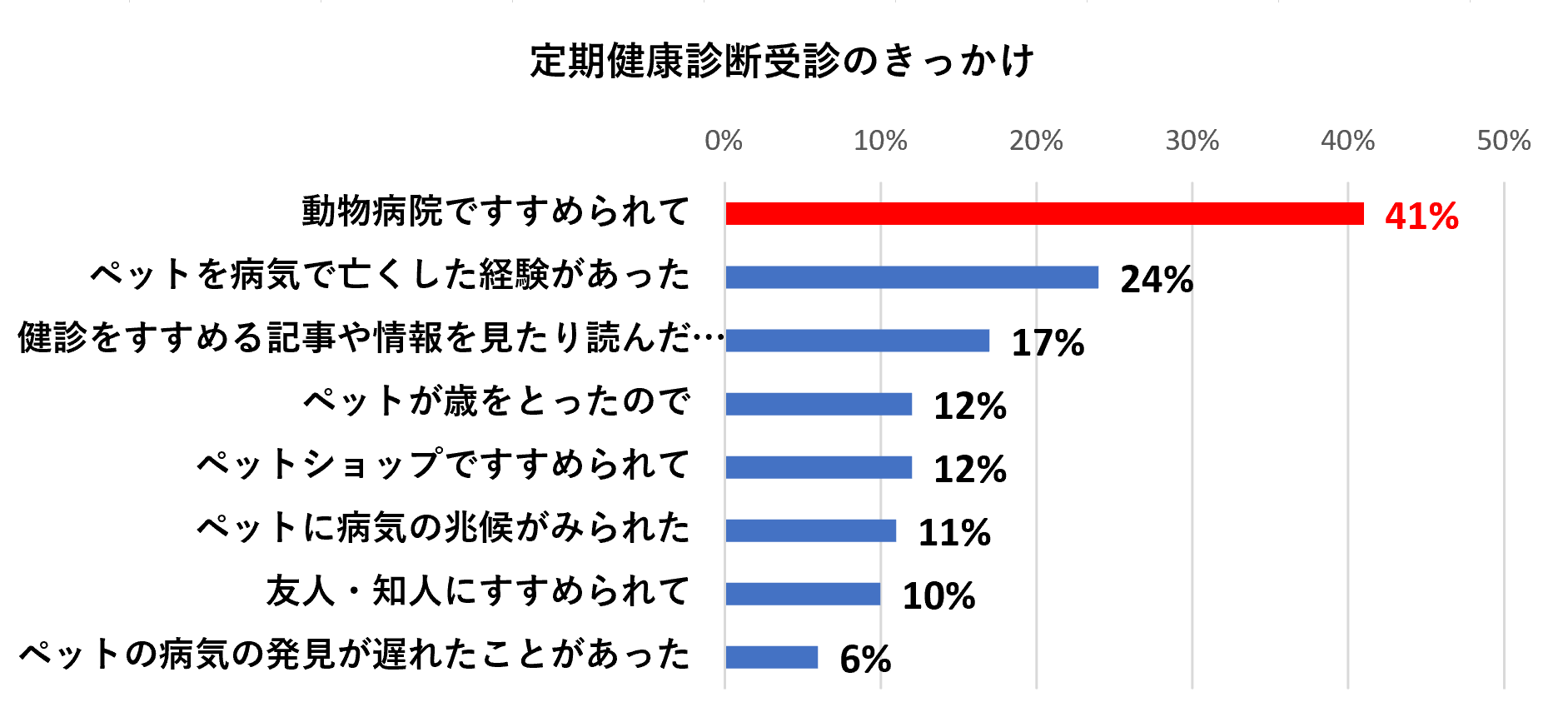 ●受診のきっかけは、「動物病院ですすめられて」が50%と圧倒的に多い。ワクチン接種やフィラリア予防でその際にすすめられたのがきっかけになったと考えられ、動物病院による健康診断啓発の成果があがっている。