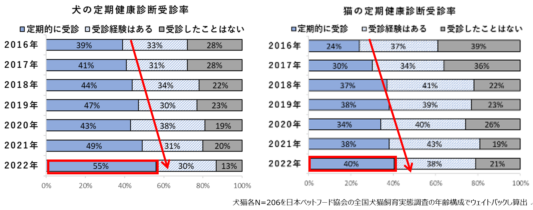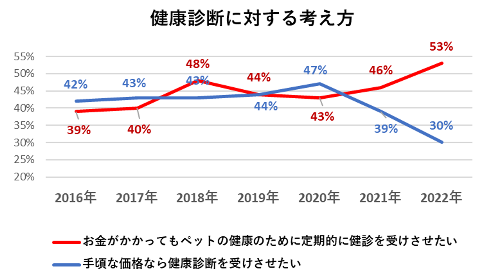2016年には、「手頃な価格なら健康診断を受けさせたい」という考え方が優勢であったが、2021年以降、「お金がかかってもペットの健康のために健康診断を受けさせたい」が逆転し、2022年には過半数を超えました。
