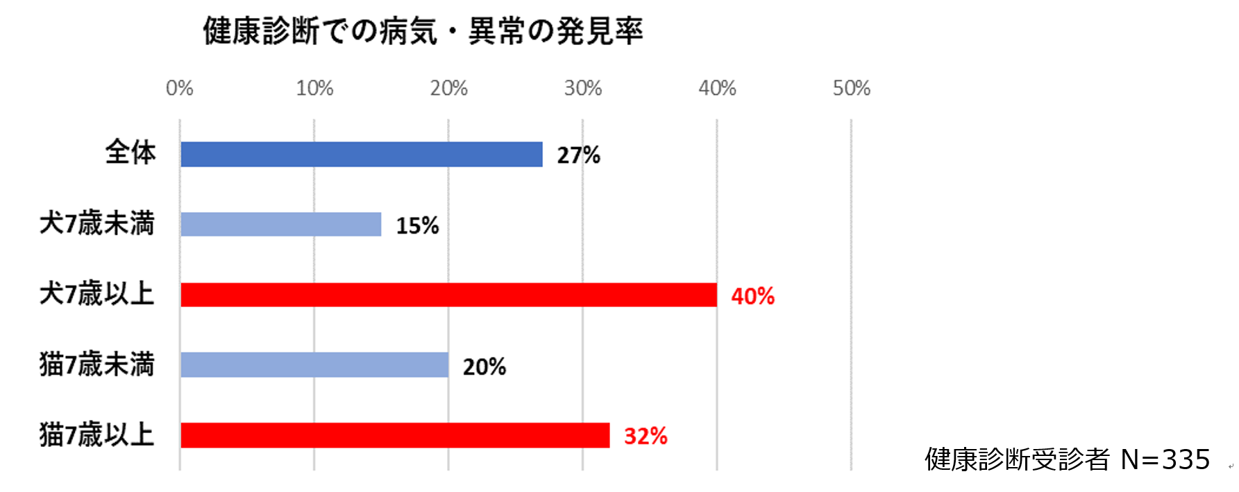 ●健康診断で病気や異常が見つかった経験は27%。7歳以上では、犬40%、猫32%が見つかっており、リスクが高まるため、若い年齢からの健康診断受診による早期発見が重要。