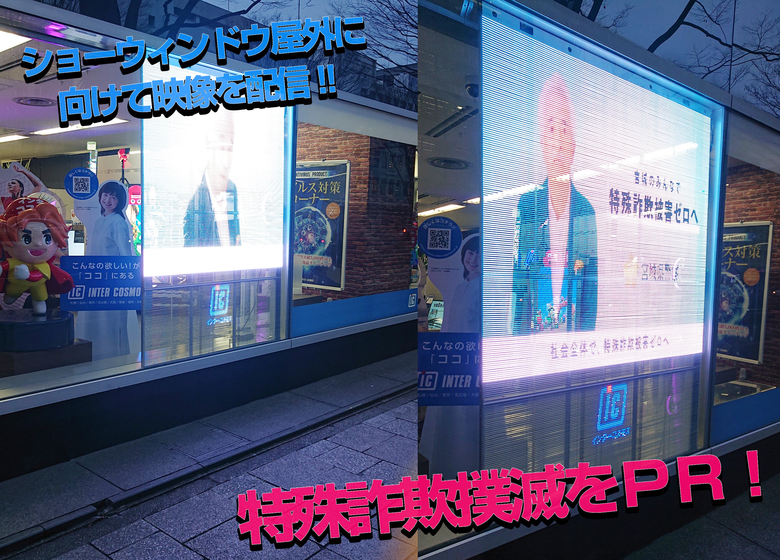 同社は昨年、自社ショールームの屋外向けLEDウィンドウサイネージにて、特殊詐欺被害対策のPR映像を配信し、地域住民に向けて特殊詐欺の手口や恐ろしさを映像コンテンツ配信を通じて啓蒙活動を実施した。今回の授与は本取組にて宮城県警に協力したことを評価されたものです。