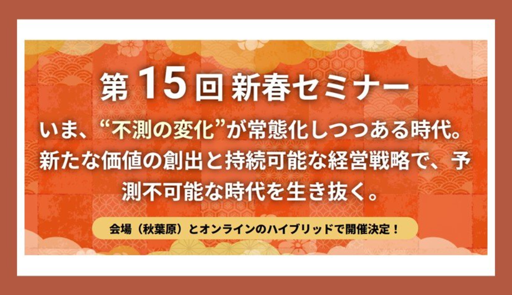 第15回目となる今回の新春セミナーでは、当社代表・チーフコンサルタント角井からは旬な話題から、今後の経営判断に役立つポイントまでお伝えいたします。また、株式会社ウェザーニューズ代表取締役社長の草開千仁氏からは、全世界約80億人規模のサポーターによる最強にして最大のコンテンツに加え、ご自身が経営トップとなったときの苦難や、これからの後継者選びについてお話いただきます。さらに、新春特別パーティーのゲストとして障がい者雇用を支援している、株式会社ミンナのミカタHDの代表取締役CEO&創業者の兼子文晴氏をお招きします。障がい者雇用率の引き上げが見込まれる今、障がい者雇用への取り組みをより一層求められておりますが、会社の実例も交えてお話いただきます。