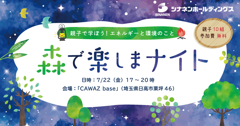 シナネンホールディングスは、総合エネルギーサービス企業グループとして、持続可能な社会の実現に向けた社会貢献活動の一環で、エネルギーと環境をテーマに、さまざまな教育・啓蒙活動を実施しております。「森で楽しまナイト」は、“親子で楽しく学べる”をコンセプトに、エネルギーと環境について学んでいただく場をつくるため新たに企画いたしました。