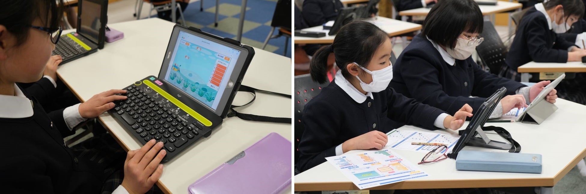 5年生と6年生の授業では、最近注目されている「ブルーカーボン」を題材にしたプログラミングを学習しました。児童のみなさんは、普段から学習でよく使用しているiPadで、ブロックプログラミングソフトのScratchを通して授業を受けます。空気中の二酸化炭素は、陸生の植物からだけではなく海の中でも光合成によって吸収され、酸素としてまた空気中に放出されます。水中で光合成をする代表的な植物「アマモ」を使って、「ブルーカーボン」のしくみをもとにしたゲーム作成に取り組んでもらいました。
