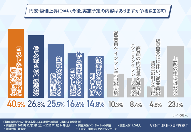 - 経営者の3割が、円安・物価上昇によるコスト高騰によって利益が減少したと回答した。今後の対策として「値上げ」を予定しているという回答が最多に