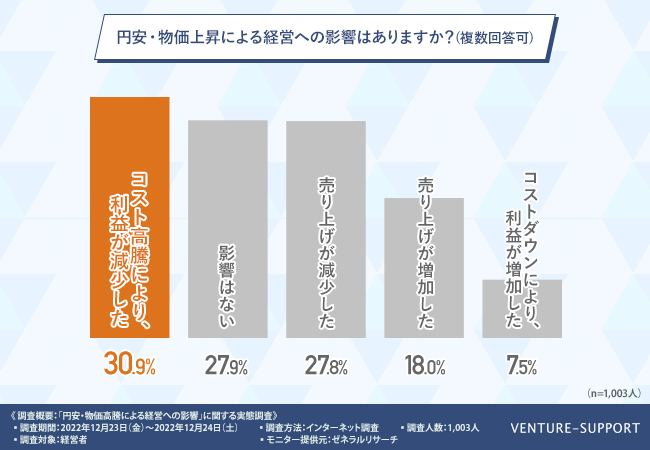 - 経営者の3割が、円安・物価上昇によるコスト高騰によって利益が減少したと回答した
