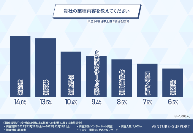 「製造業(14.0%)」「建設業(13.5%)」「不動産業(10.4%)」「企業向けサービス業(9.4%)」「情報通信業(8.6%)」「医療・福祉(7.6%)」「卸売業(6.5%)」「個人向けサービス業(6.2%)」「小売業(5.6%)」「金融業(4.1%)」「運輸業(4.0%)」「飲食店・宿泊業(3.4%)」「教育関連業(2.1%)」「その他(4.6%)」