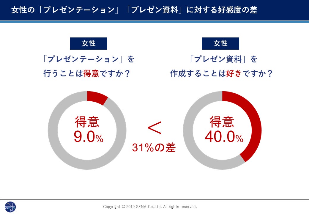 ・女性は、プレゼンテーション得意割合9%に対して、プレゼン資料作成が好きと回答した割合は40%と31%の開き