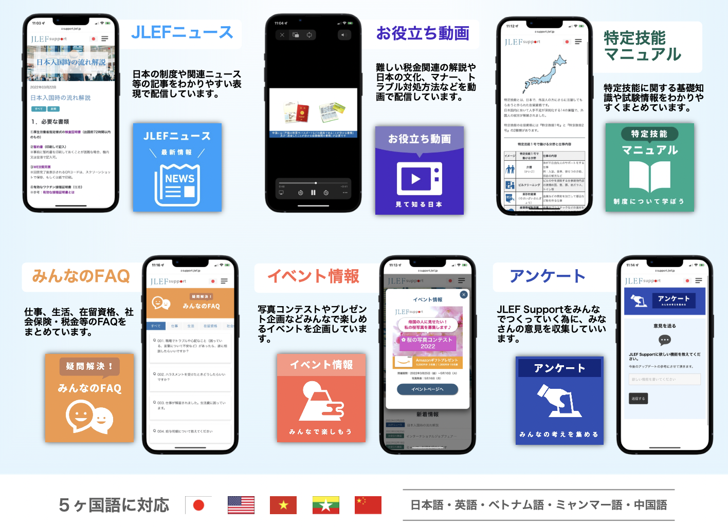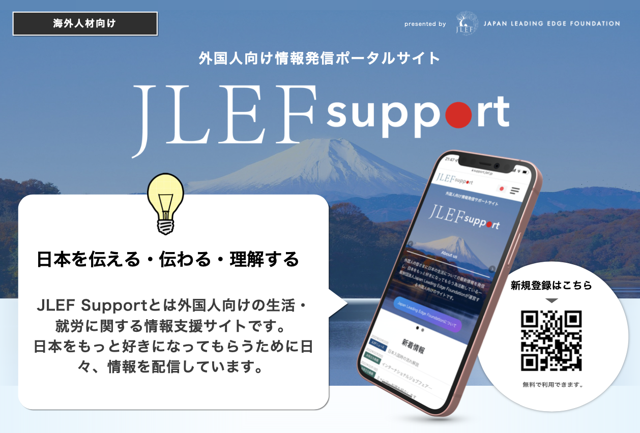 JLEFsupportは、日本で働いている外国人、日本で働きたい外国人に向けた情報ポータルサイトです。日本での生活、仕事、制度や文化に関する情報をわかりやすく提供しています。日本で生活する外国人スタッフの視点で企画し、5カ国(日本語・英語・ベトナム語・ミャンマー語・中国語)に対応しています。