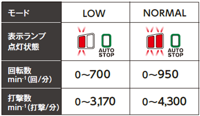 ワンプッシュで作業内容に合わせて回転数・打撃数を切り替えることができます。もろい材料への穴あけがしやすくなります。