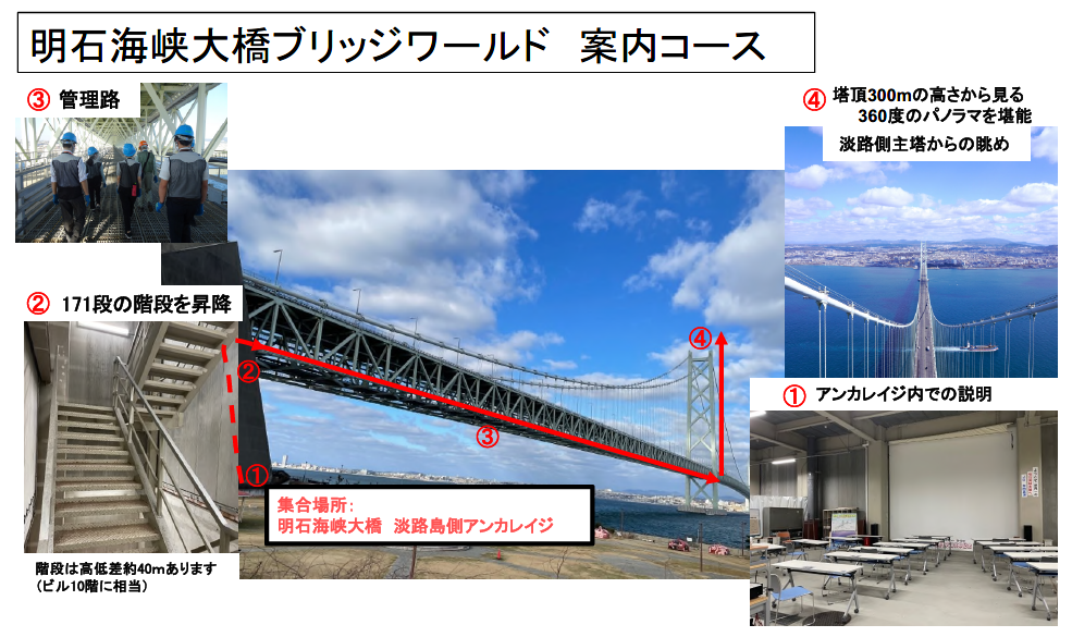 ※往路復路において、明⽯海峡⼤橋の管理路の高さ約40m(ビル10階相当)171段の階段を昇降していただきます。