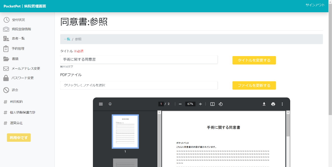 同意書・誓約書をウェブ上で管理することができます。診察中、その場で同意書が必要になった場合、デジタル端末の画面上で簡単に患者さまに同意していただけます。また、クリニックから事前に同意書を送り、患者さまに同意していただくこともできるので診察~治療がスムーズに進みます。また、その後各患者さまに紐づいて同意書や誓約書の内容を管理することができます。