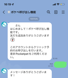 あらかじめ患者さまにPocketPet公式LINEとご自身のLINEを連携していただくことで、診察の順番が近づいたタイミングで、LINEを通じて患者さまを呼び出すことができます。患者さまも待ち時間を短縮することができますし、ペットクリニックも診察の順番に遅れる患者さまを減らすことができます。