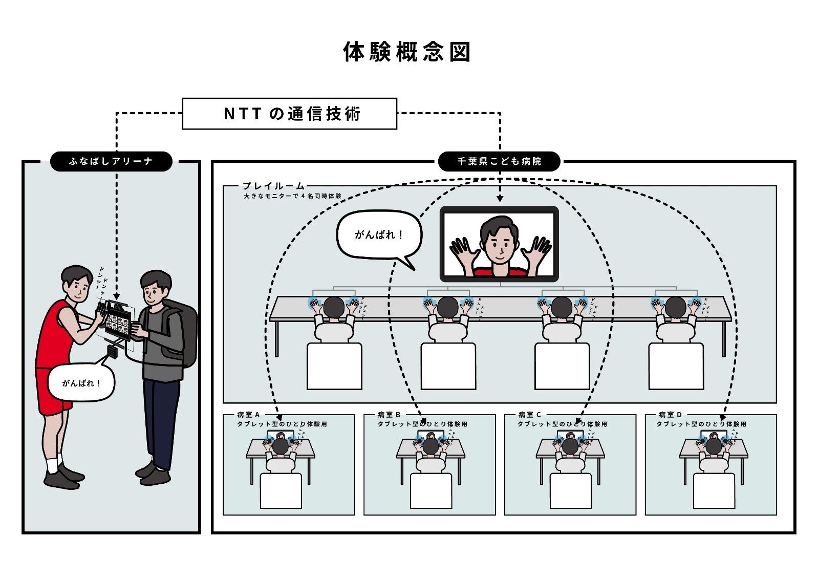 株式会社千葉ジェッツふなばし(本社:千葉県船橋市、代表取締役社長:田村 征也)と東日本電信電話株式会社 千葉事業部(千葉市美浜区、執行役員千葉事業部長:境 麻千子、以下「NTT 東日本」)は、千葉ジェッツふなばしの所属選手である#31原 修太選手の社会貢献活動「ハラの輪」の一環として、2月12日(日)の名古屋ダイヤモンドドルフィンズ戦において、NTT社会情報研究所(以下「NTT社会研」)と千葉県こども病院の協力のもと、NTT社会研で研究中の”振動伝送技術を用いたウェルビーイングな体験デザイン”を活用し、長期入院治療中の小児患者(及びそのご家族)がいる病棟と原選手をはじめとする千葉ジェッツふなばしの選手達がいる船橋アリーナをインターネットで繋ぐ「ポータブルハイタッチ」(離れていても触れ合う感覚を伝えられる体験)を実施します。