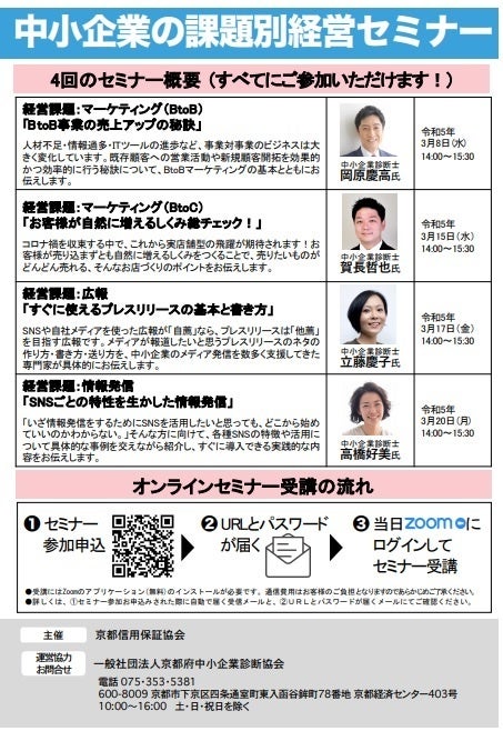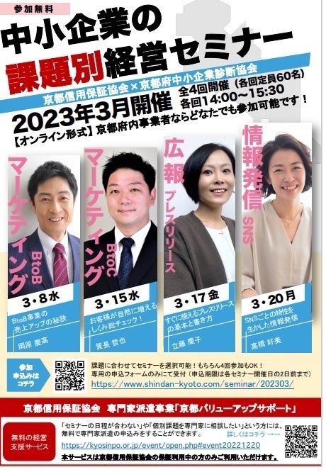 京都信用保証協会と(一社)京都府中小企業診断協会が連携し、京都府下の中小企業者を対象にオンラインセミナーを開催いたします。同セミナーは、令和5年1月から2月にかけて開催した「中小企業の課題別経営セミナー」の第二弾です。