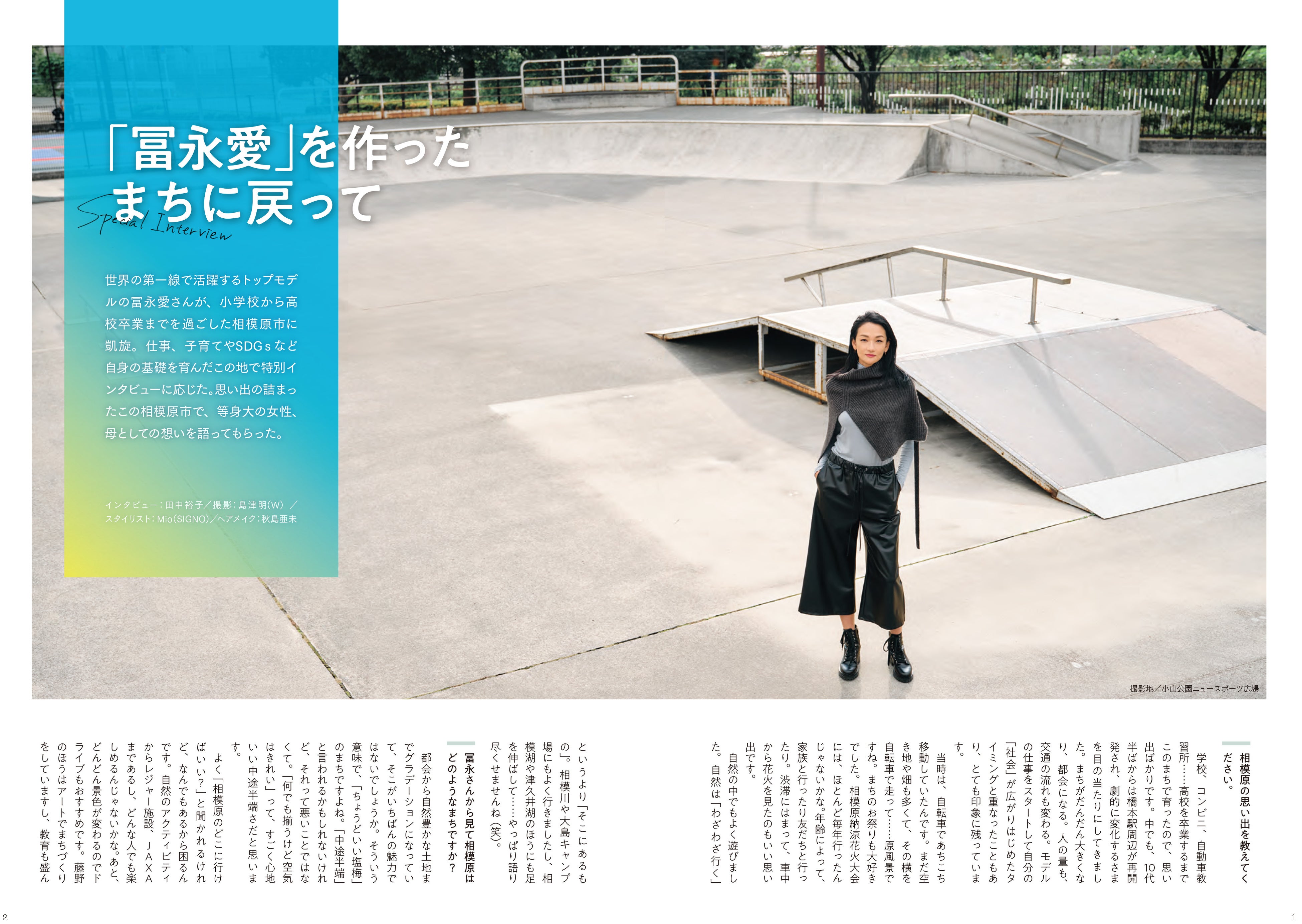 小学校から高校卒業までを相模原市で過ごした冨永愛さん。仕事や子育て、SDGsなど自身の基礎を育み、たくさんの思い出が詰まったこの地で、等身大の女性、母としての思いを語ってもらいました。