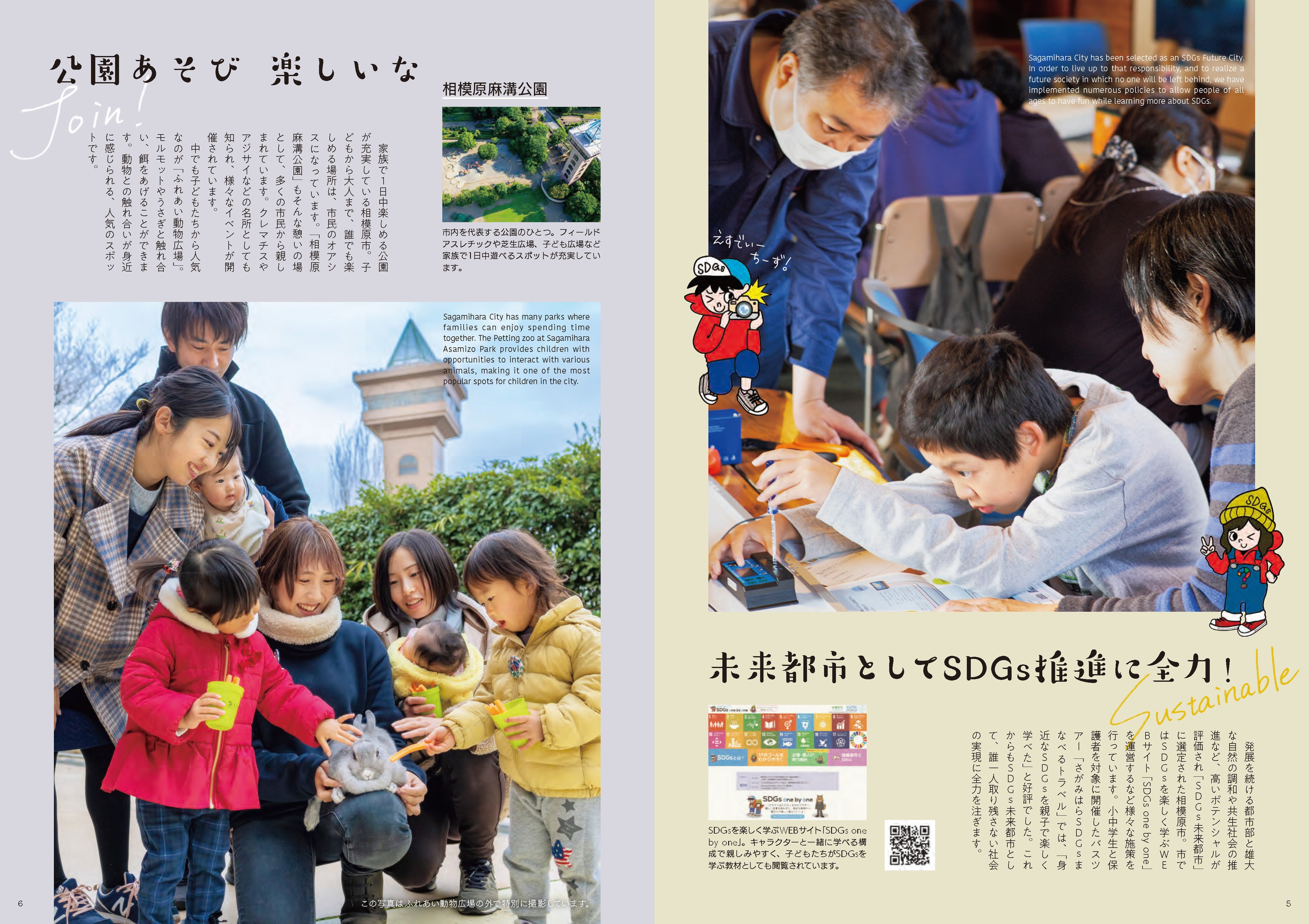 SDGs未来都市、市内外から人気の相模原麻溝公園、JAXA相模原キャンパス、キャンプ場を始めとする豊かな自然といった相模原市の魅力を、子どもたちや親子の笑顔と共に紹介しています。