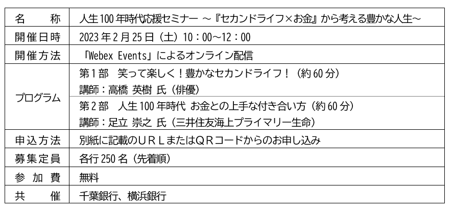 千葉銀行(頭取 米本 努)は、2023年2月25日(土)、コンコルディア・フィナンシャルグループの横浜銀行(頭取 片岡 達也)と「千葉・横浜パートナーシップ」に基づく連携施策として、退職世代からシニア世代のお客さまとそのご家族を対象とした「人生100年時代応援セミナー ~『セカンドライフ×お金』から考える豊かな人生~」を共催します。
