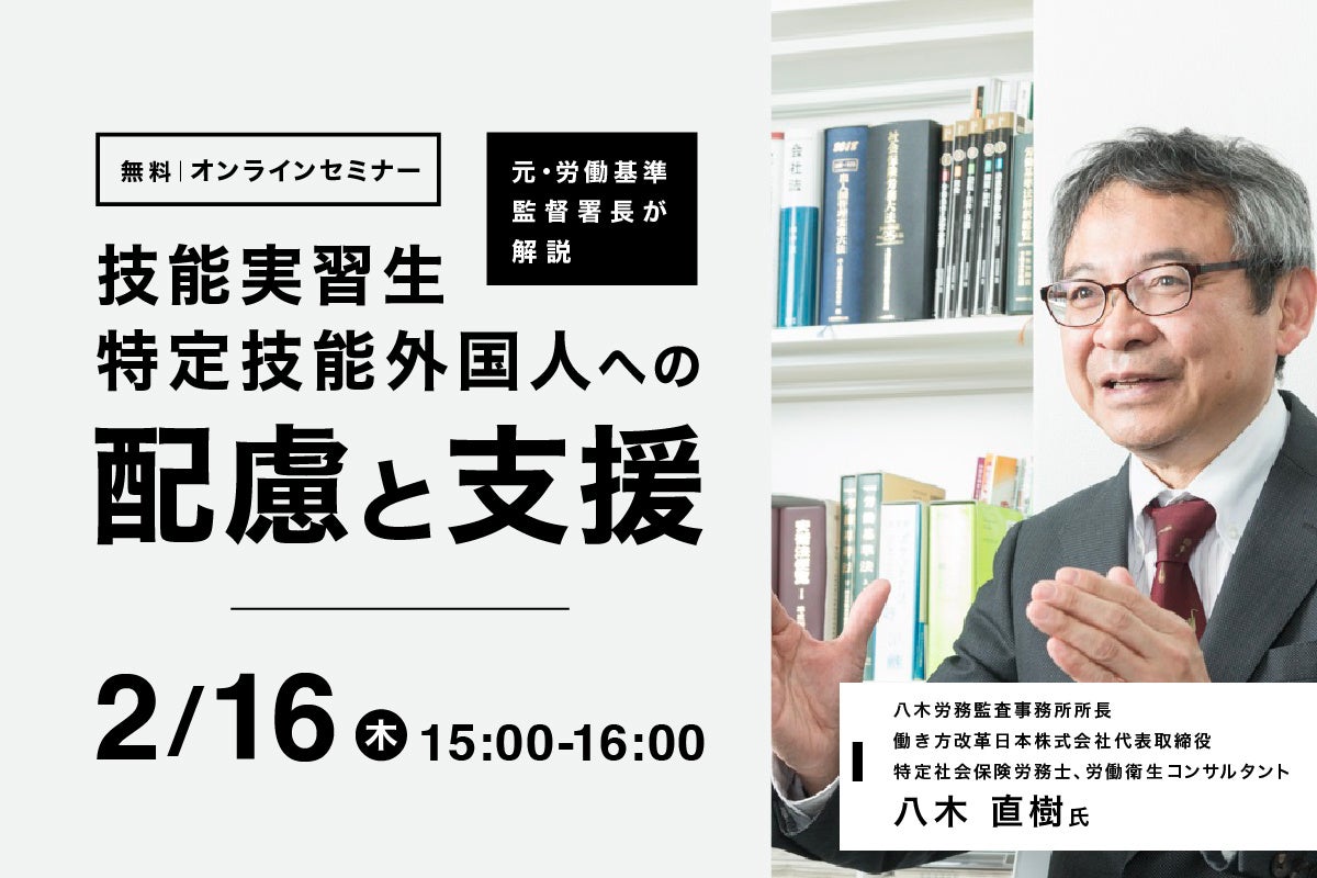 本セミナーでは、労働基準監督署長の経験を持つ八木 直樹氏をお招きし、技能実習生と特定技能外国人への配慮と支援について解説します。