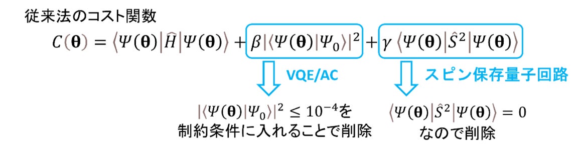 この問題の解決の切り札として注目を集めているのが量子コンピューターです。量子コンピューター上で励起状態を計算するためには、基底状態と励起状態を表現できる量子回路※12と励起状態計算を行うためのコスト関数を適切に設計しなければなりません。量子コンピューターを用いた計算には、必ず誤差※13が含まれるため、誤差を最小におさえる量子回路の設計が重要課題でした。また、励起状態計算に適切なコスト関数が、分子構造によって異なるため、すべての分子構造に共通して適用可能な計算方法が求められていました。