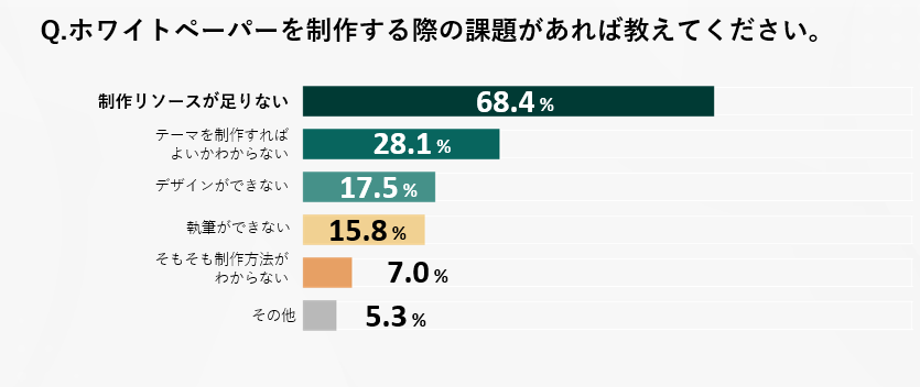 ホワイトペーパー制作の課題として多いのは断然「制作リソースが足りない」(68.4%)でした。