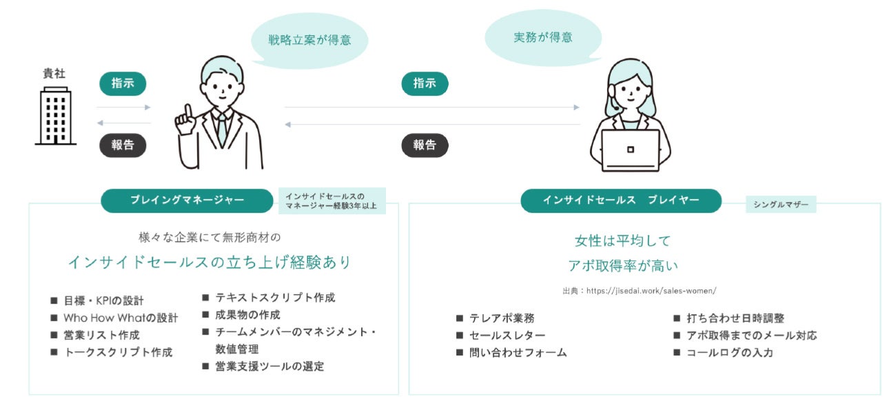 また、企業とシングルマザーの間にはプロジェクトマネージャーが間を繋ぐことで安心してサービスを利用できる仕組みになっており、プロジェクトマネージャーはインサイドセールス経験3年以上のエキスパートが担当することで、精度が高い営業戦略の立案と実行を効率よく回すことができます。