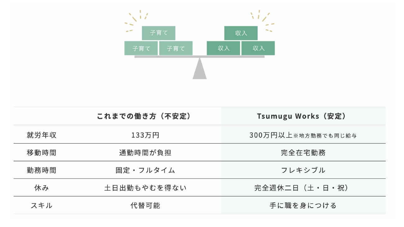 「Tsumugu Works(つむぐワークス)」では、ひとり親世帯のくらしに真正面から向き合い、シングルマザーの新しい働き方やモデルケースを発信していきます。