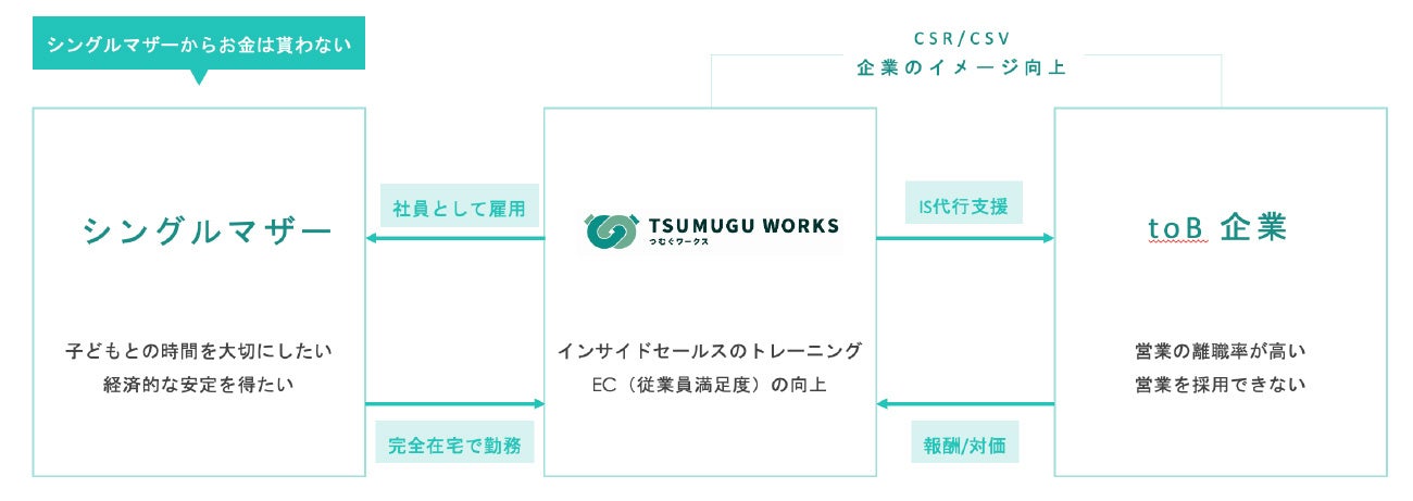 「Tsumugu Works(つむぐワークス)」は、シングルマザーの「働き方」に対する問題と、企業が抱える「営業人材」の問題を同時に改善するビジネスモデルです。シングルマザーは業務委託ではなく、社員として採用し、アウトソーシング(BPO)でインサイドセールスの仕事を請け負っています。