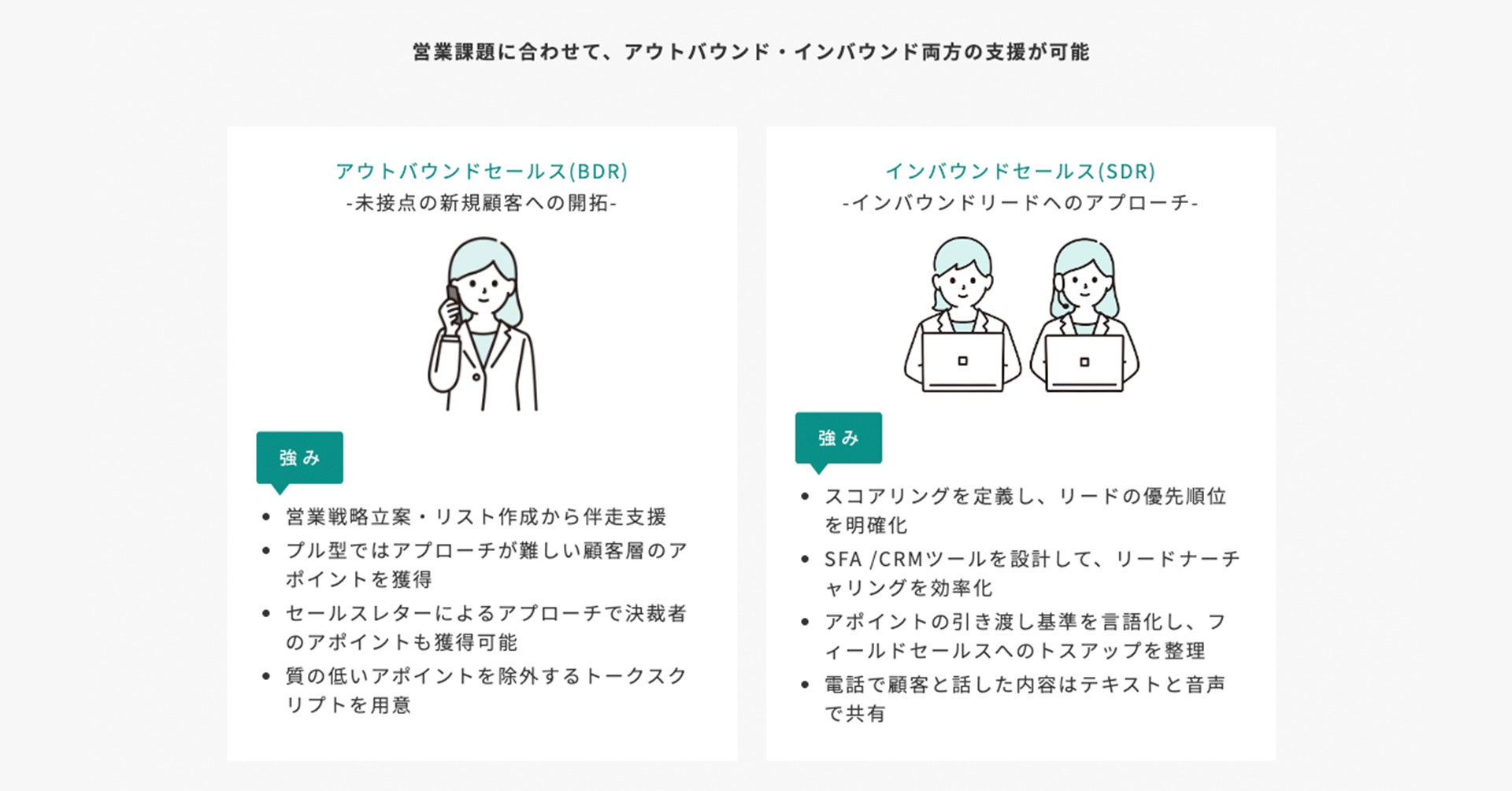 インサイドセールスの中でも、有力ターゲットの未接点顧客を開拓する「アウトバウンドセールス(BDR)」、展示会やWEB経由のリードから有効商談を生み出す「インバウンドセールス(SDR)」の両方において支援が可能です。