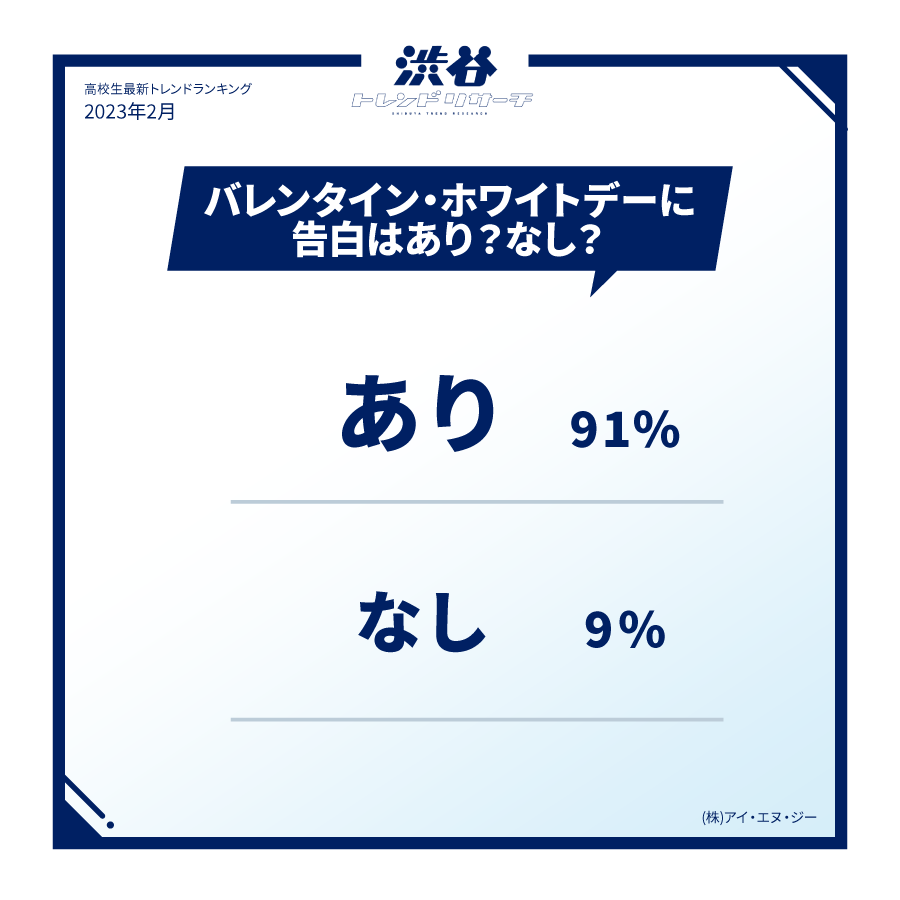 王道のシチュエーションではあるものの、「漫画やドラマの主人公になったみたいで憧れる」という声が多く寄せられました。また、”あり”派を選んだ女子高校生からは「告白は敢えてしないけど、チョコで意識はさせたい」といった意見も見られ、バレンタインにチョコ渡すことで相手に好意を気付かせる”好きバレ”を狙うのが令和流バレンタインのようです。