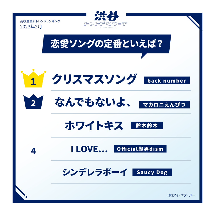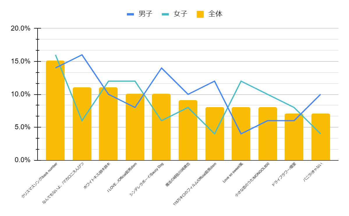 back numberの『クリスマスソング』が1位を獲得。令和以降にリリースされた楽曲が上位を占めています。全体として映画やドラマでタイアップされた楽曲を選ぶ傾向が見られたほか、2位にランクインした鈴木鈴木の『ホワイトキス』や、10位のきゃないの『バニラ』はTikTokなどのSNSでカップルの記念日動画に使われていることから、恋愛ソングの定番として高校生達に定着しているようです。