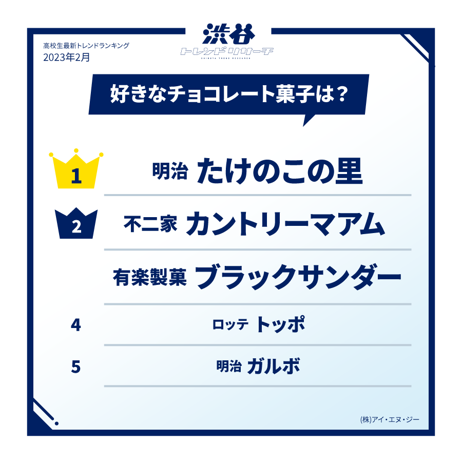 「明治 たけのこの里」が1位を獲得。2位に圧倒的な差をつける結果となりました。コンビニで購入出来るチョコレート菓子が多数ランクインしているほか、友達とシェア出来ることや、授業と授業の合間に手軽に食べられるサイズ感であることも高校生が注目するポイントのようです。「明治 たけのこの里」「不二家 カントリーマアム バニラ&ココア」「有楽製菓 ブラックサンダー」の上位3商品は、弊社で2022年8月に実施した調査「高校生が選ぶ好きなお菓子ランキング2022」でも10位以内にランクインしており、高校生からの根強い人気が窺えます。