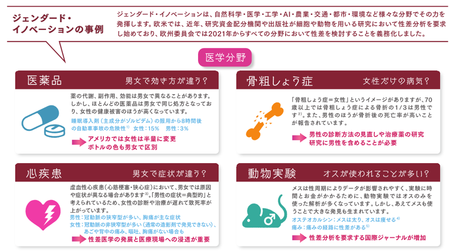 ジェンダード・イノベーションとは、性差(セックスとジェンダー)を考慮して研究を行うことでイノベーションを創出し、社会実装へつなげようという概念です。これまで見落とされてきた、生物学的及び社会学的性別の性差を考慮した研究から得られる成果に基づき、未来社会に適合した生活者向けの製品やサービスの開発と提供が可能になることが期待されています。