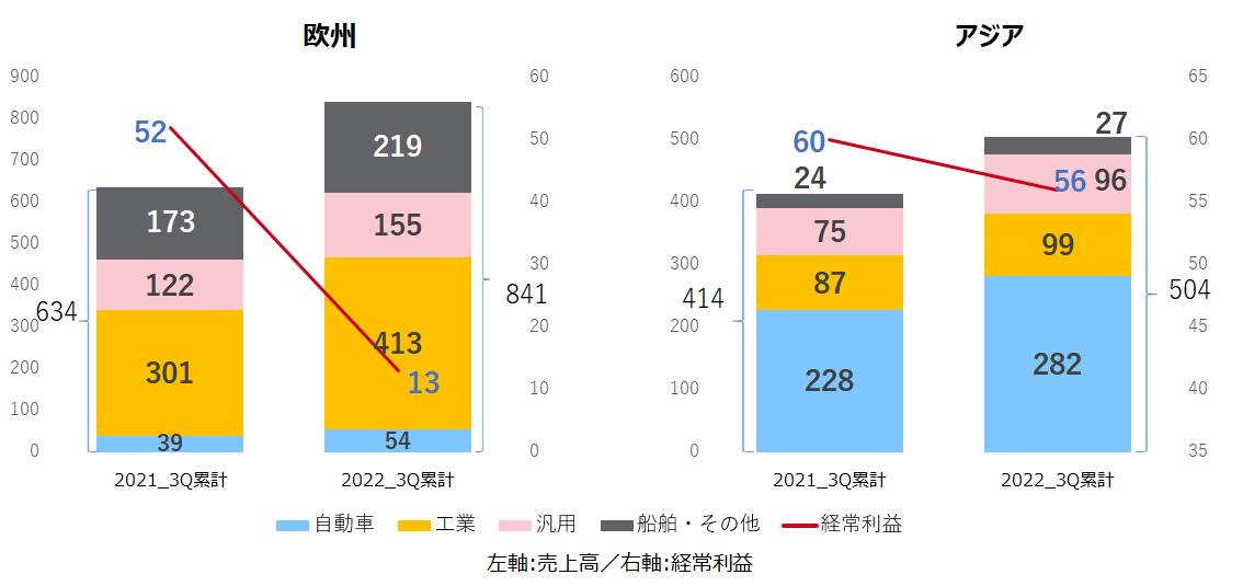 ・工業向けで増収も、経常利益では大幅な減益(―39億円)。トルコにおけるハイパーインフレーションの影響は、約18億円。この他エネルギーコストや人件費およびロジスティックス費用の高騰などが主要因。