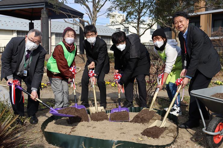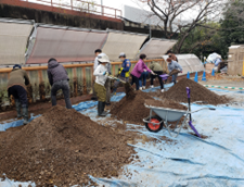 ・完熟たい肥お引渡し会要領:公園内の花壇に移動し、以下参列者で肥料を施肥しました