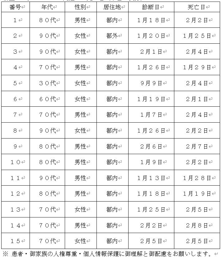 新型コロナウイルスに関連した患者の死亡について business Twitter Facebook はてブ Pocket LINE コピー 2023.02.09 この記事は約1分で読めます。 都内で新型コロナウイルスに感染した方が死亡されましたのでお知らせします。 お亡くなりになった方のご冥福をお祈り申し上げます。 1 新型コロナウイルスに関連した死亡者(本日公表分) 2 新型コロナウイルスに関連した死亡者の累計 7,783人