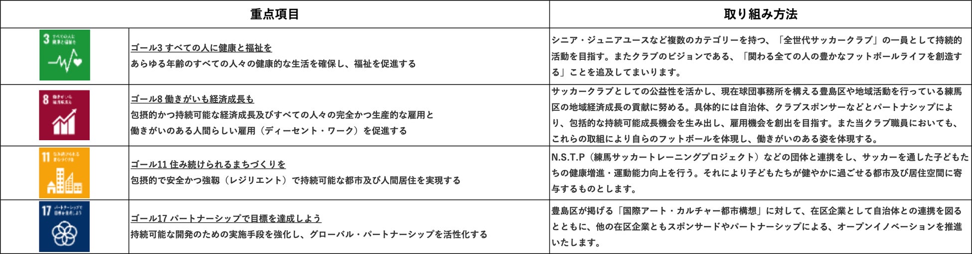 エリース東京FCは、Jリーグの参入を目指すサッカークラブとして、シニア・ジュニアユースなど多くのカテゴリーを持つクラブの社会人チームとして、17のゴールの中から、4つの項目に対してアクションを行うものとします。