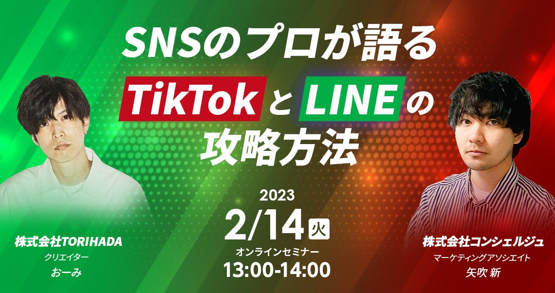 株式会社TORIHADA(本社:東京都渋谷区、代表取締役社長:若井映亮)は、株式会社コンシェルジュとともに「SNSのプロが語るTikTokとLINEの攻略方法」と題したウェビナーを2023年2月14日(火)13時に開催いたします。