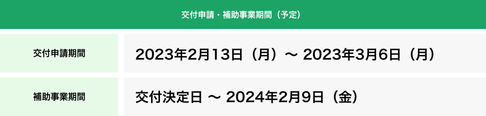 - 2023年2月13日(月)から2023年3月6日(月)まで、本事業の補助金の公募を行います。応募条件に該当する事業者の皆様は、是非ご応募下さい。ご不明点がある方は、事務局までお問い合わせください。