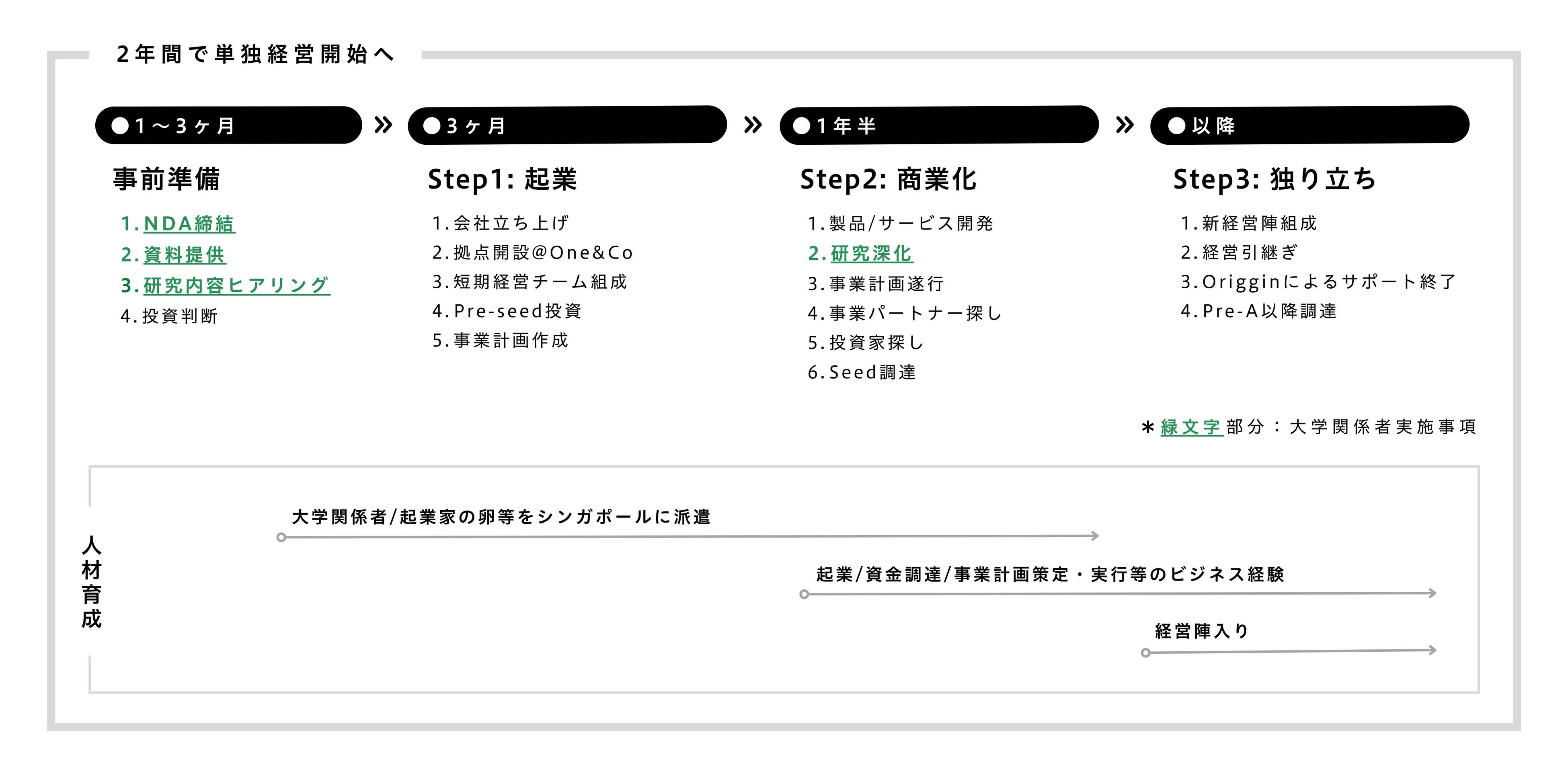 ⽇本のDeep-Tech研究(室/者)は、One&Co もしくは JR東⽇本シンガポール事務所を通じてAdapt に参加いただきます。その後、参加者はOrigginとも連携しながらシンガポールに拠点を構え、技術シーズを育て、東南アジア各国での事業展開を進めていきます。Adaptは、事業化スキーム開始から2 年を⽬安に研究者が研究進化に専念しながら、独立できる環境づくりをサポートしていきます。