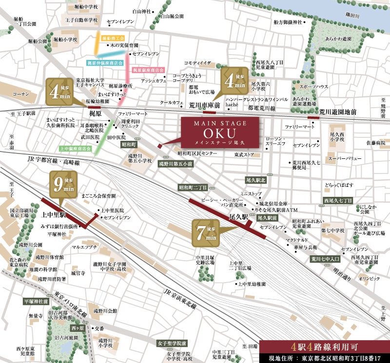 交 通:JR上野東京ライン(宇都宮線、高崎線)「尾久」駅徒歩7分、東京さくらトラム(都電荒川線)「梶原」