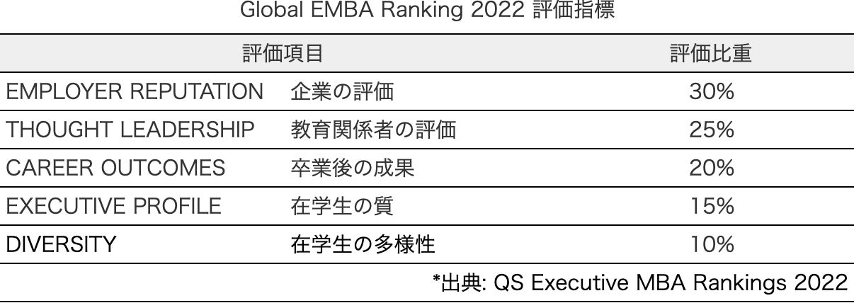 QS社は、高等教育の世界3大ランキング機関の1つであり、毎年世界中の高等教育機関を対象としたランキングを公表しています。今回のGlobal Executive MBAランキングは、国際認証取得などの基準を満たした世界48カ国220校の経営大学院を対象として審査されました。ランキングのための主な評価要素は、以下となります。