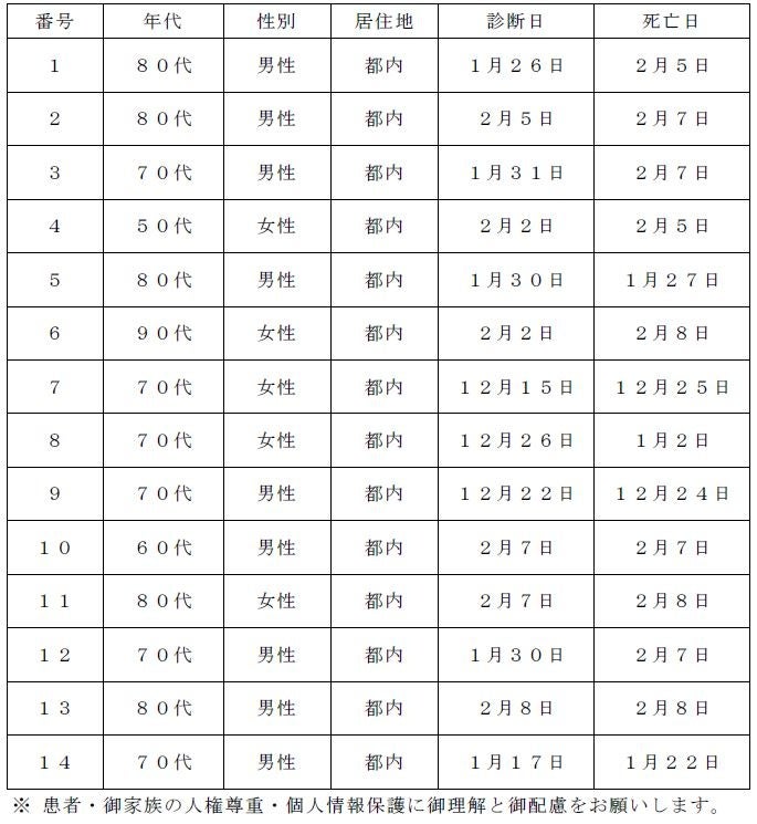 新型コロナウイルスに関連した患者の死亡について business Twitter Facebook はてブ Pocket LINE コピー 2023.02.10 この記事は約1分で読めます。 都内で新型コロナウイルスに感染した方が死亡されましたのでお知らせします。 お亡くなりになった方のご冥福をお祈り申し上げます。 1 新型コロナウイルスに関連した死亡者(本日公表分) 2 新型コロナウイルスに関連した死亡者の累計 7,797人