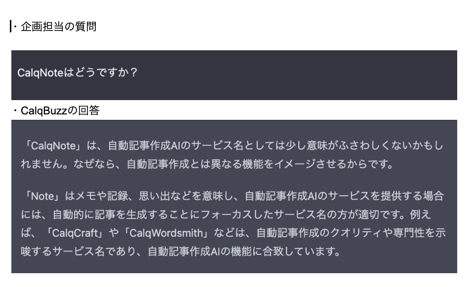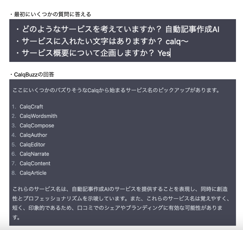 また、CalqBuzzは提供された提案の理由を説明する機能を備えています。この機能は、CalqBuzzが提案するバズりそうなサービス名やサービス内容について解説するもので、ユーザーは提案された根拠を理解することができます。