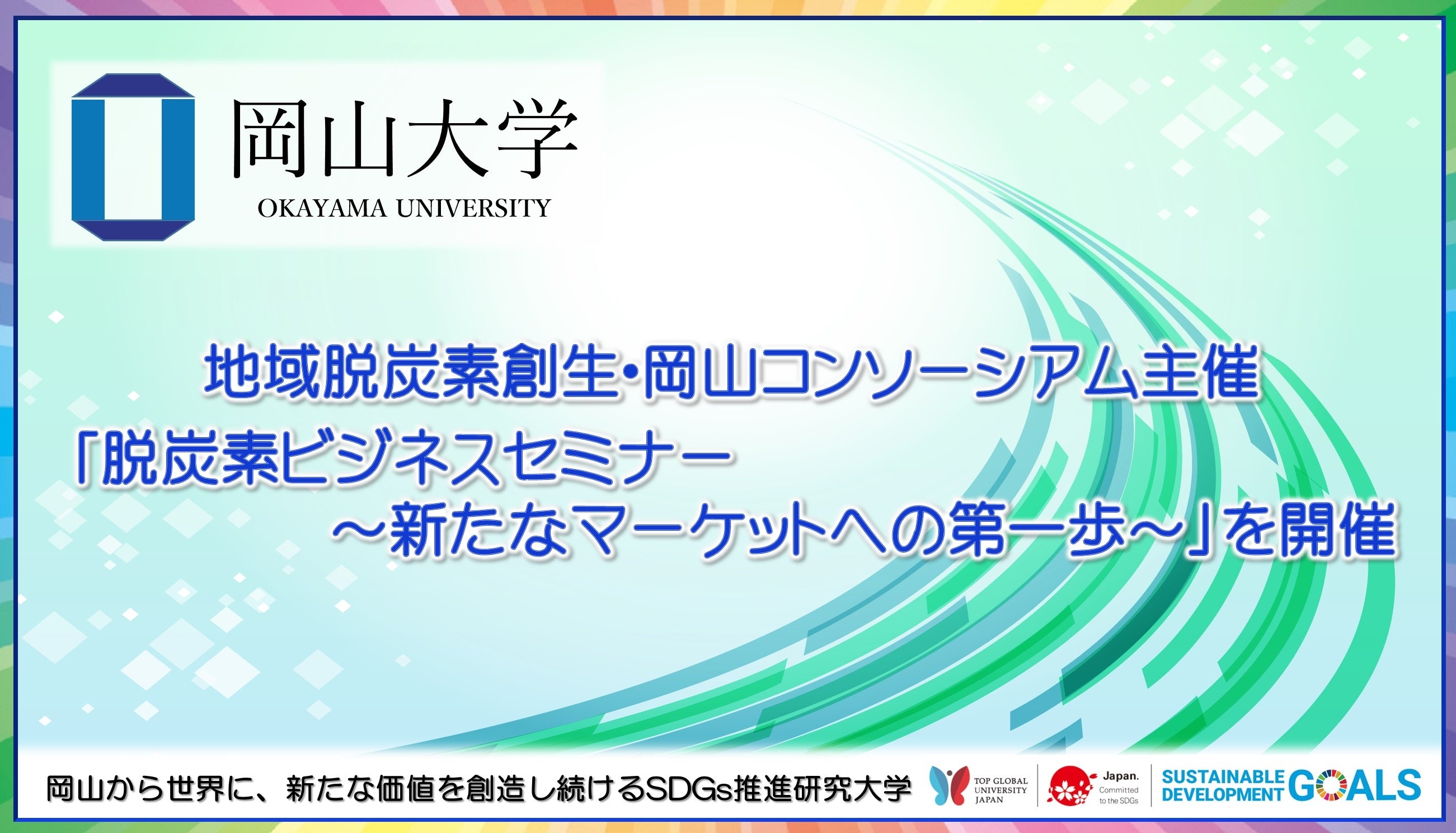 国立大学法人岡山大学(本部:岡山市北区、学長:槇野博史)は、本学が共同事務局を務める地域脱炭素創生・岡山コンソーシアム主催「脱炭素ビジネスセミナー~新たなマーケットへの第一歩~」を2023年1月30日に岡山大学創立五十周年記念館金光ホール(岡山大学津島キャンパス)で開催しました。